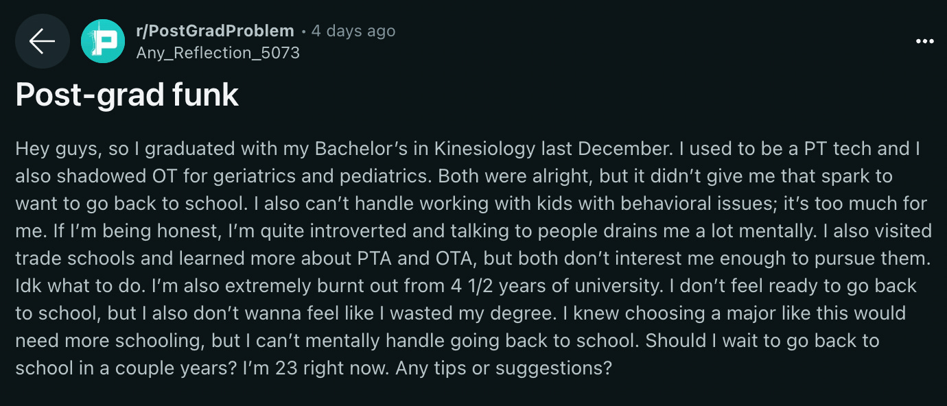 Here we have a recent graduate struggling with where to go from here. The postgrad funk is certainly a relatable one, so hopefully this person receives sage advice or even some motivation. Should they go back to school to perhaps pursue a different career, or should they stick to their current path?