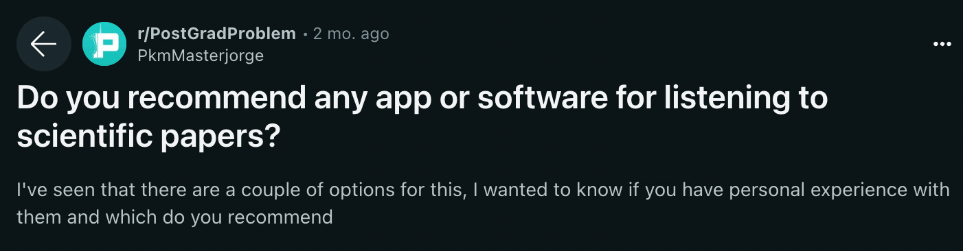 Seems like a fairly straightforward question, no? This person wants to listen to scientific papers as opposed to reading them. Let’s see if they receive a good recommendation.