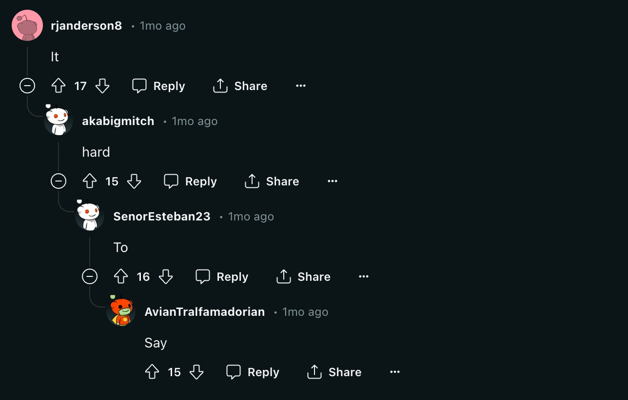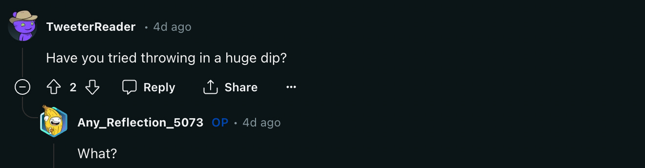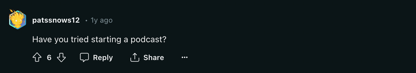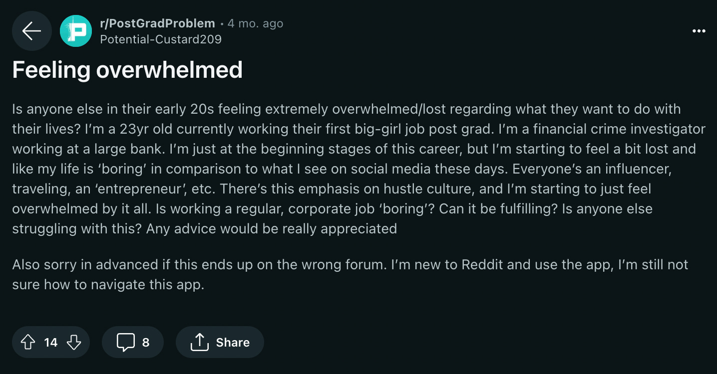 This one has a more serious tone. This new Reddit user is feeling the weight of starting on the bottom rung of the corporate ladder. She’s stressed and overwhelmed. Is this the right career for her? What is she missing out on? Are her peers doing bigger and better things and passing her by? It’s just a lot.