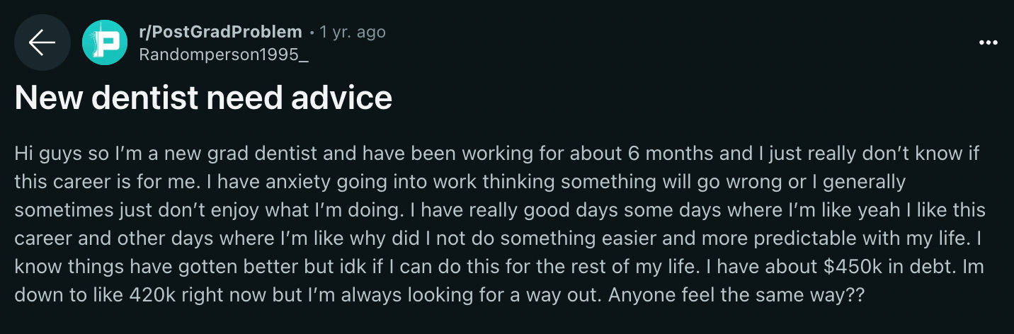 This new dentist isn’t sure if this career is right for them. Not quite fulfilling enough, it seems. Switching careers at this point is a tough call considering all the student debt they’ve amassed, not to mention the years of school invested in becoming a dentist. Where should they go from here?
