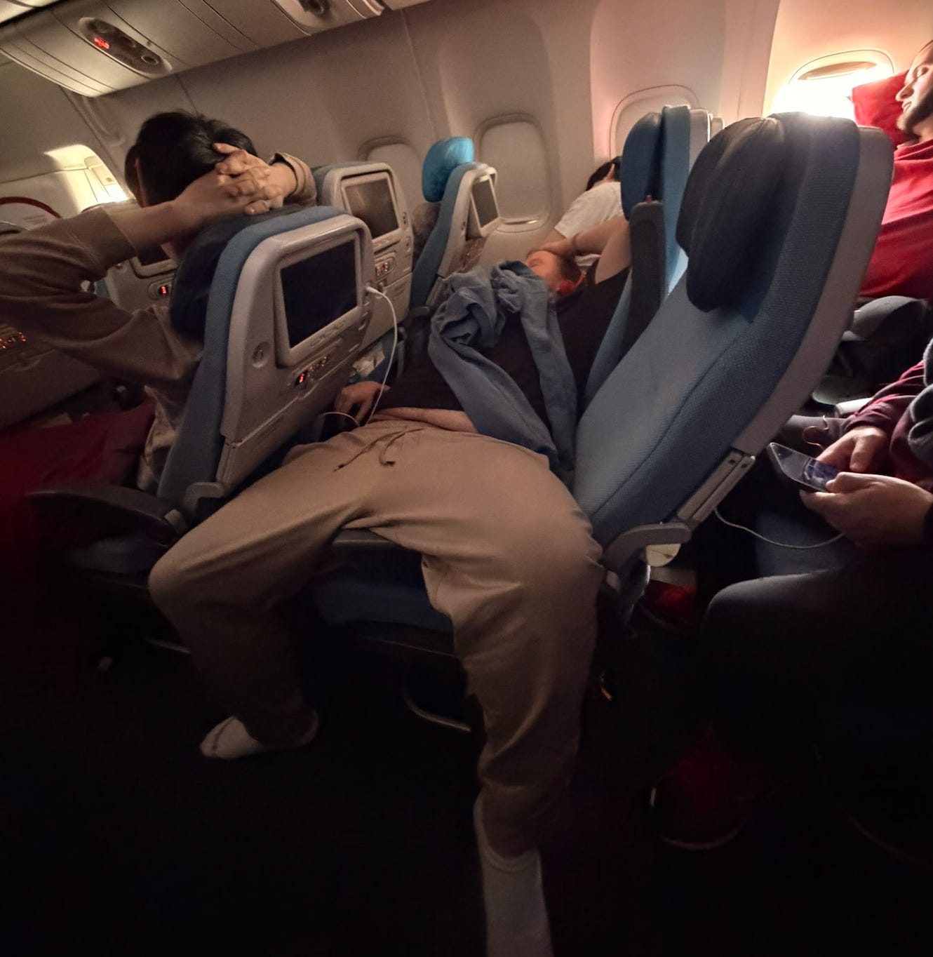 Notice that his seat is fully reclined. This is another controversial topic amongst travelers. You have people who recline, and people who don’t recline because they deem it inconsiderate of the passenger sitting behind them. Personally, I don’t mind people who recline. Especially on long flights such as this one. The seat was designed to recline. Go ahead and get cozy.