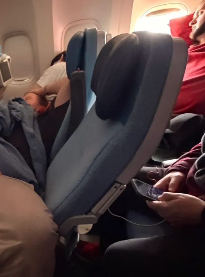 What’s hilarious in this picture is that Mintzy’s seat is fully reclined, BUT he’s not even taking advantage of it. He’s lying down flat on his back. His back isn’t on the reclined part. He’s reclining for no other reason than to very slightly violate his rear passenger’s personal space. For the love of the game.