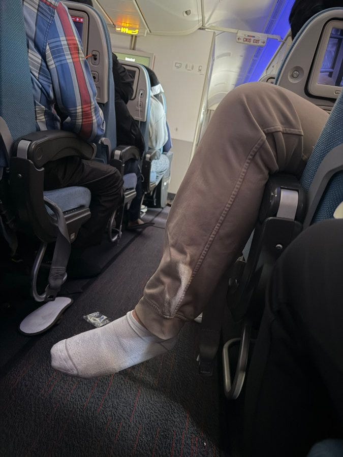 Now imagine your feet are protruding more than halfway across the only aisle that connects the front of the plane to the rear. Then imagine someone trying to get past you, or a flight attendant trying to push the cart by. Yikes.